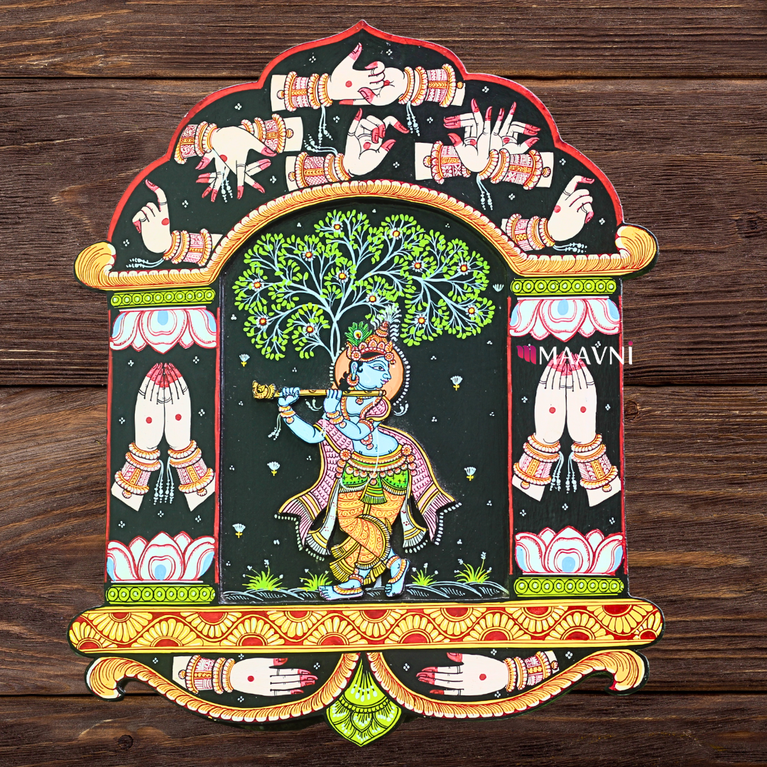 This is a traditional Hand-Painted Wooden Krishna 3DJharokha depicting Lord Krishna playing the flute under a...