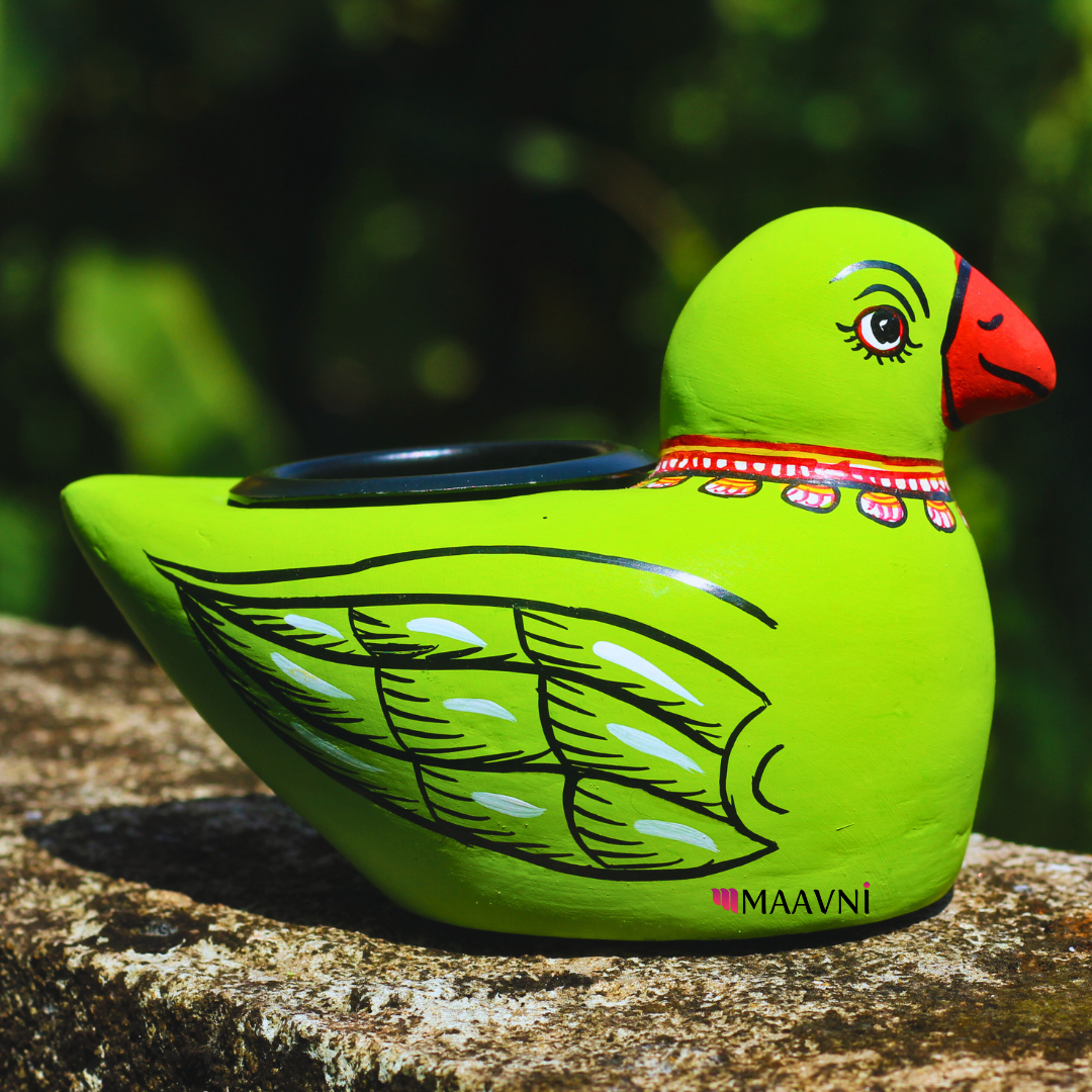 Hand-Painted Paper Mache Green Parrot T-Light Holder