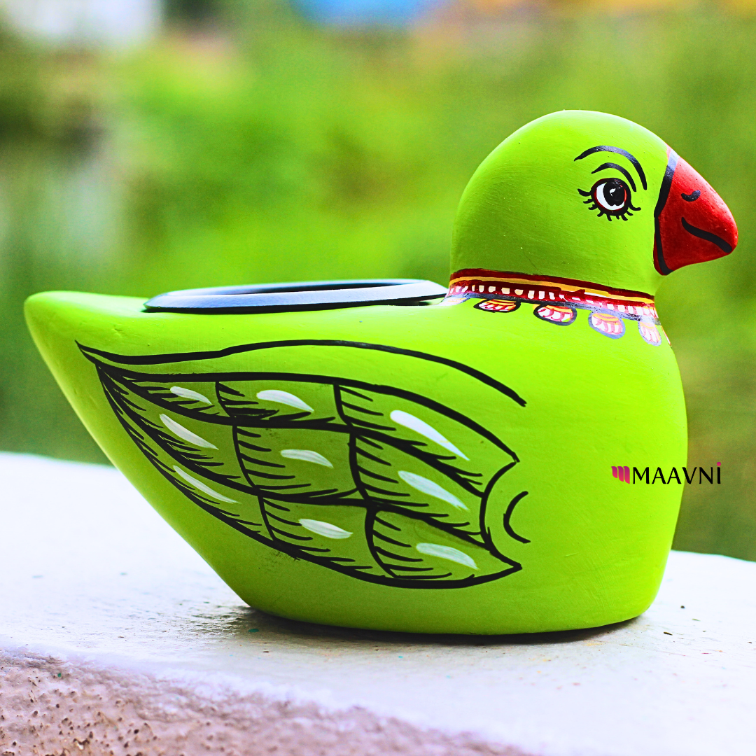 This is a hand-painted Paper Mache Parrot T-Light Holder decorative piece shaped like a parrot, designed with a hollow space on the back that can be used as a candle holder, diya holder, or small planter. The vibrant green with contrasting red beak and traditional motifs makes it a perfect item for home décor, festivals, or gifting. It beautifully blends functionality with traditional Indian folk art aesthetics.