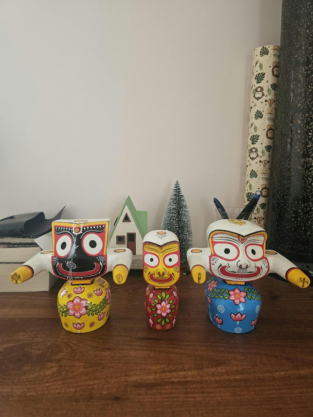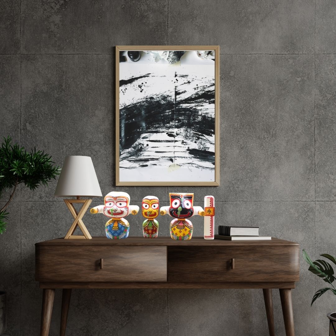 Bring home the divine essence of Puri’s sacred traditions with this hand-painted neem wood 6-inch idol set of Lord Jagannath, Lord Balabhadra, and Goddess Subhadra. Each piece is intricately carved and painted by master artisans, keeping alive the centuries-old legacy of Odisha’s heritage craft. The vibrant colors, symbolic expressions, and detailed motifs make this trio a perfect blend of spirituality and artistry.