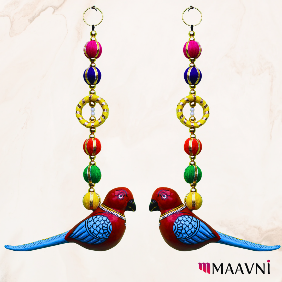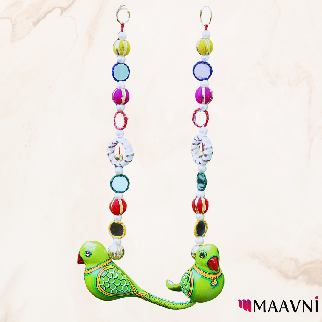 Brighten your entryway with our Parrot With Mirrors Door Hanging, a vibrant décor piece in red and green. Made with papier-mâché, mirrors, threads, canvas, and beads, this unique accessory adds charm, positivity, and traditional flair.
